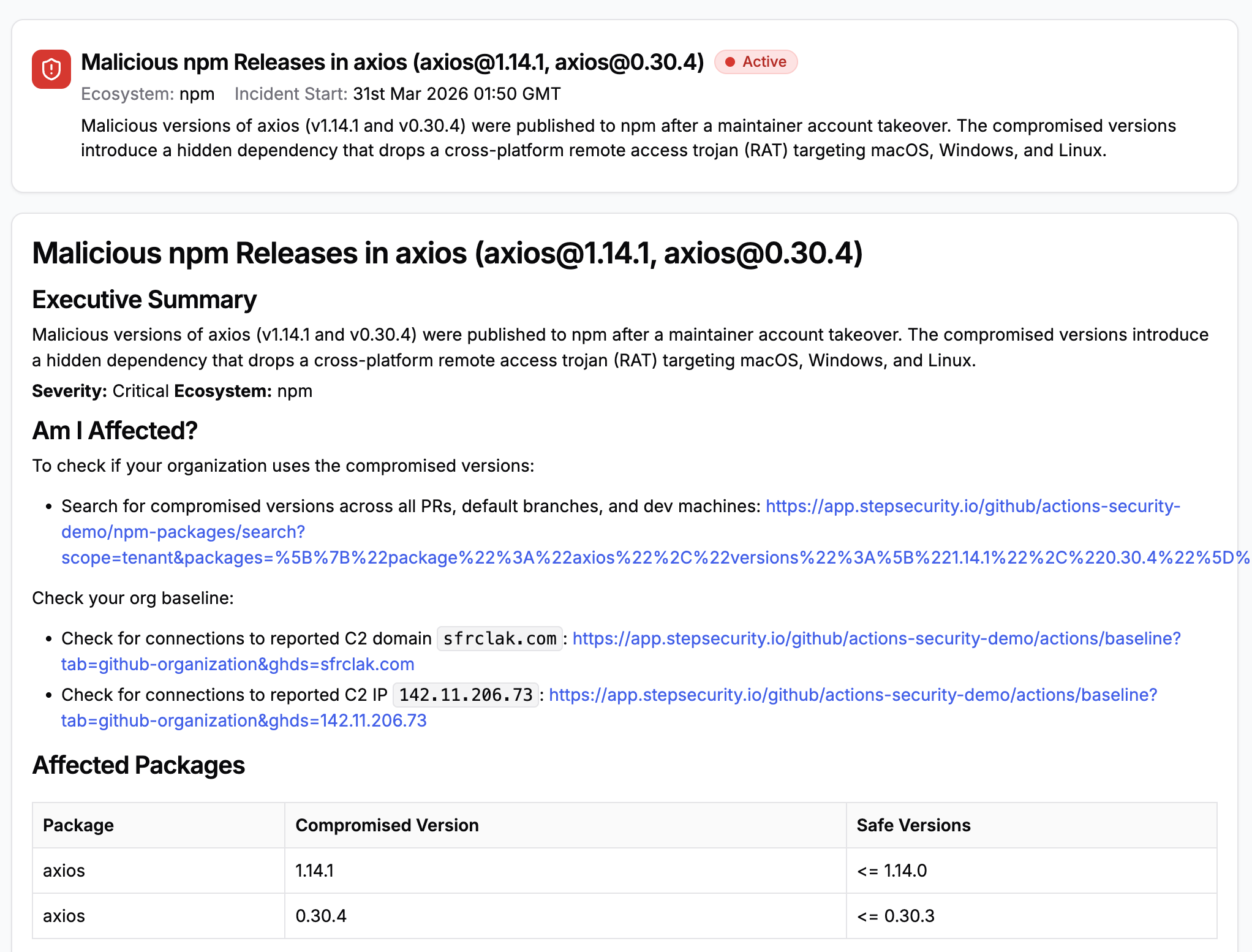 StepSecurity maintains over 250 GitHub Actions, primarily authored in Node.js, so we knew firsthand how ubiquitous axios is. The severity of this was immediately clear.