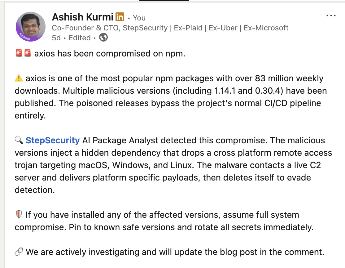 We published a blog post with a summary of our findings, including the compromised versions (1.14.1 and 0.30.4), the injected plain-crypto-js dependency, and the C2 domain. Ashish posted an advisory on LinkedIn breaking down the key indicators of compromise so that developers scrolling their feeds would see the warning.