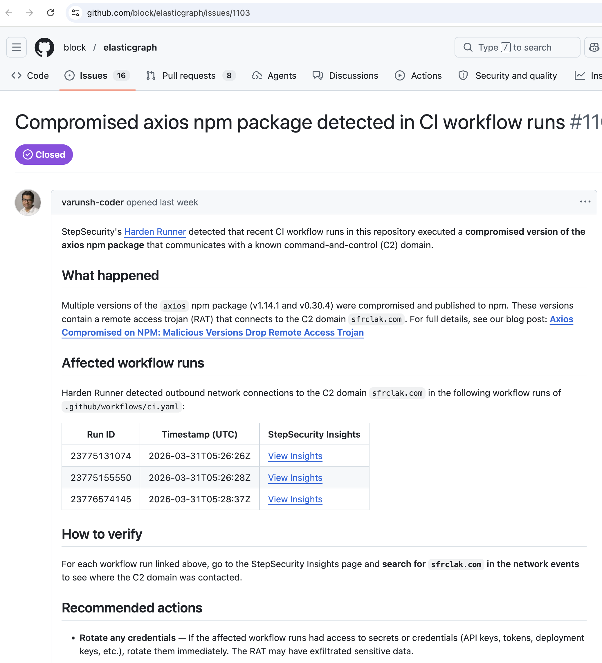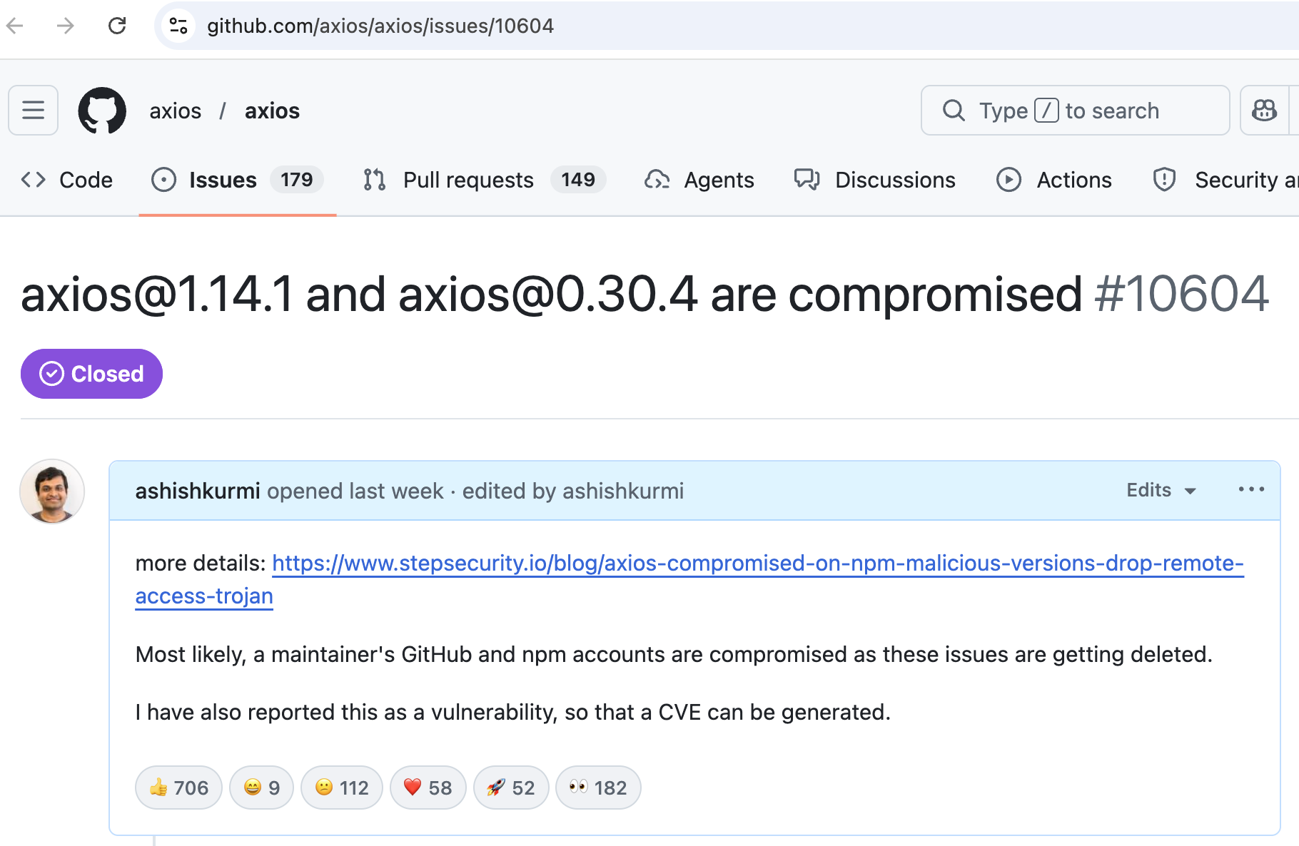 On GitHub, issue #10604 became the de facto coordination hub for the response. Community members contributed forensic details, shared detection scripts, asked and answered questions about remediation, and helped each other assess their exposure. The axios project's other collaborators worked around the clock to restore trust in the package once the compromised account was suspended, publishing clean versions and communicating transparently with their user base.
