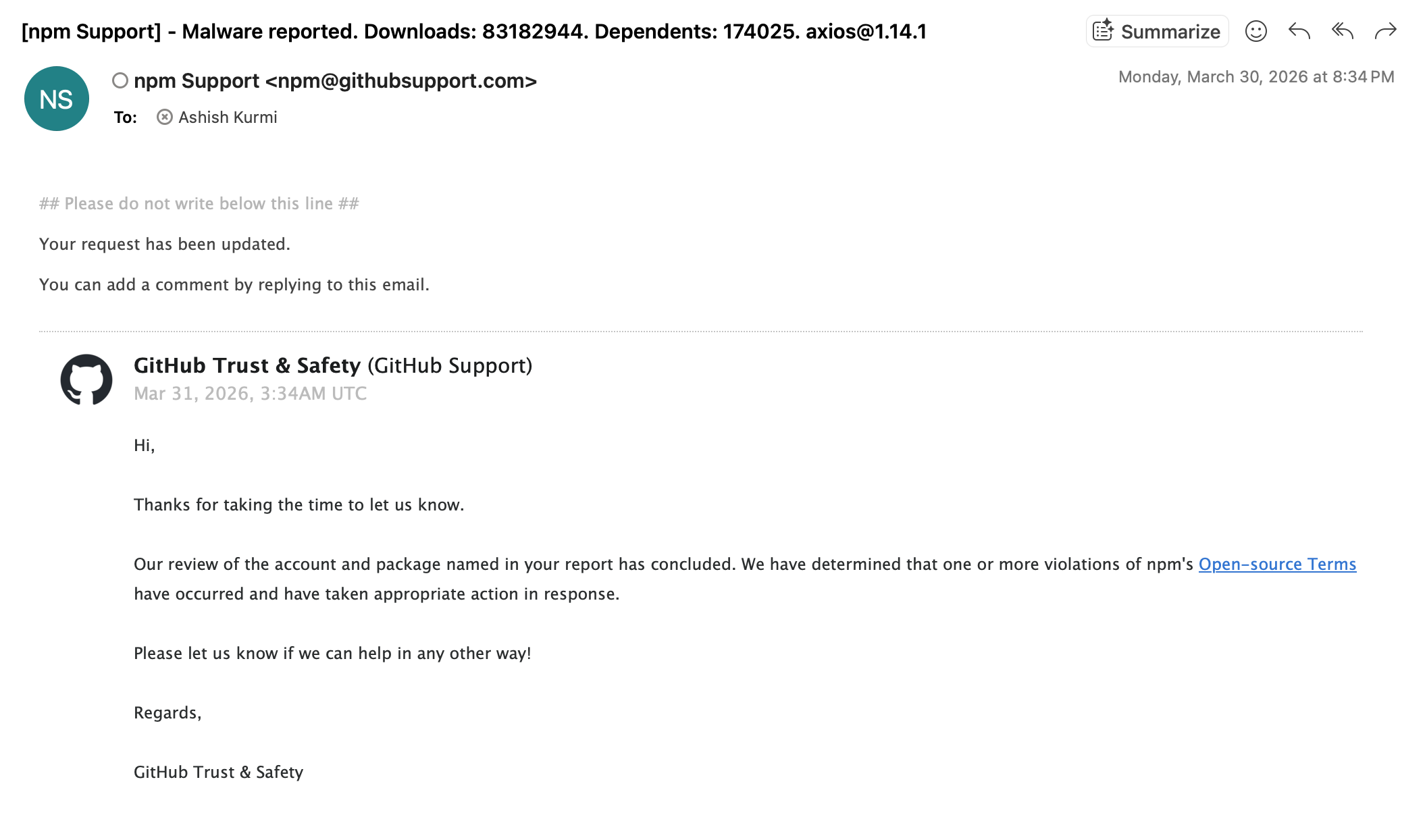 He also reported the compromised packages as malware to npm, flagging both axios@1.14.1 and axios@0.30.4 along with the malicious plain-crypto-js dependency.
